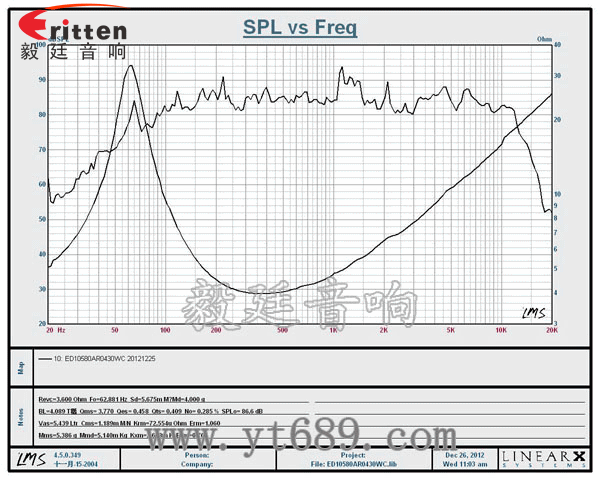 此款凸橡膠邊紙盆,額定功率30W,最大功率60W ,音色清晰、飽滿。