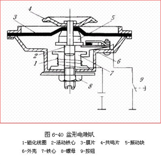如圖6-40所示為盆形電喇叭的結(jié)構。膜片、共鳴板、銜鐵、上鐵芯剛性相連為一體。當上鐵心被吸下,膜片被拉動發(fā)生變形,發(fā)生動靜。