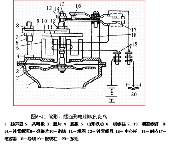 如圖6-41所示為筒形、螺旋形電喇叭的結(jié)構。它主要由膜片、共鳴板、山形鐵心、線圈、銜鐵、揚聲筒、觸點以及電容器等組成。膜片和共鳴板借中心桿與銜鐵、調(diào)整螺母、鎖緊螺母聯(lián)成一體