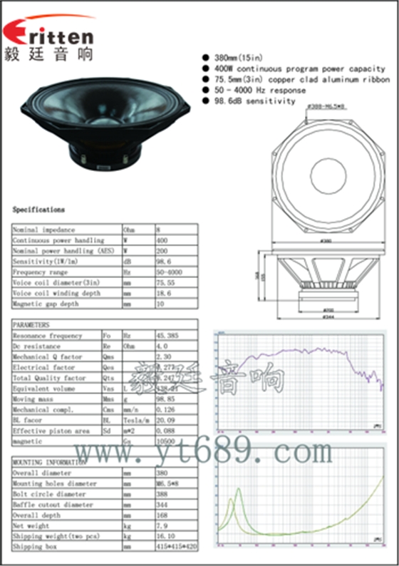 描述:異型鋁盆架布邊紙盆75芯外磁重低音15寸pa低音喇叭;