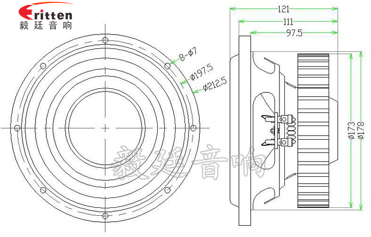 8寸圓形鐵盆架外磁重低音喇叭,采用了高性能鐵氧體,磁性強,動力足,外帶磁鋼套;