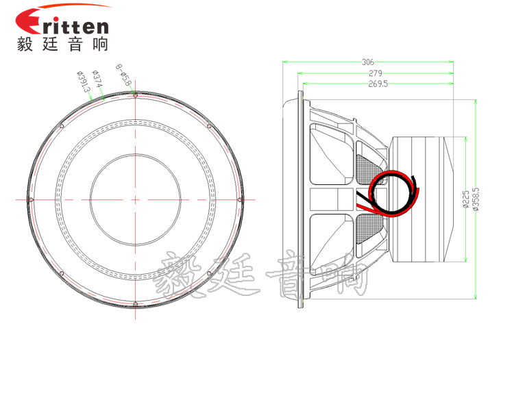 15寸圓形鑄鋁盆架重低音喇叭,采用了超大的磁體Φ225X25mm磁性強(qiáng),給喇叭提供了飽滿的動(dòng)力,低頻厚實(shí);