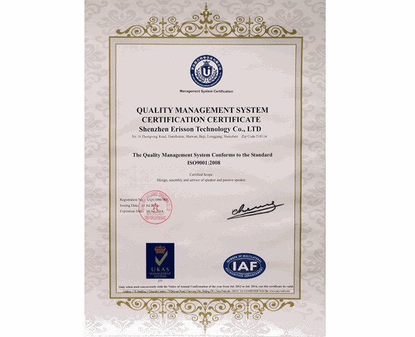毅廷喇叭廠家2008年獲得ISO9001國(guó)際認(rèn)證。毅廷專業(yè)研發(fā)生產(chǎn)藍(lán)牙喇叭、多媒體音箱喇叭等,榮國(guó)國(guó)內(nèi)外多項(xiàng)榮譽(yù)證書。